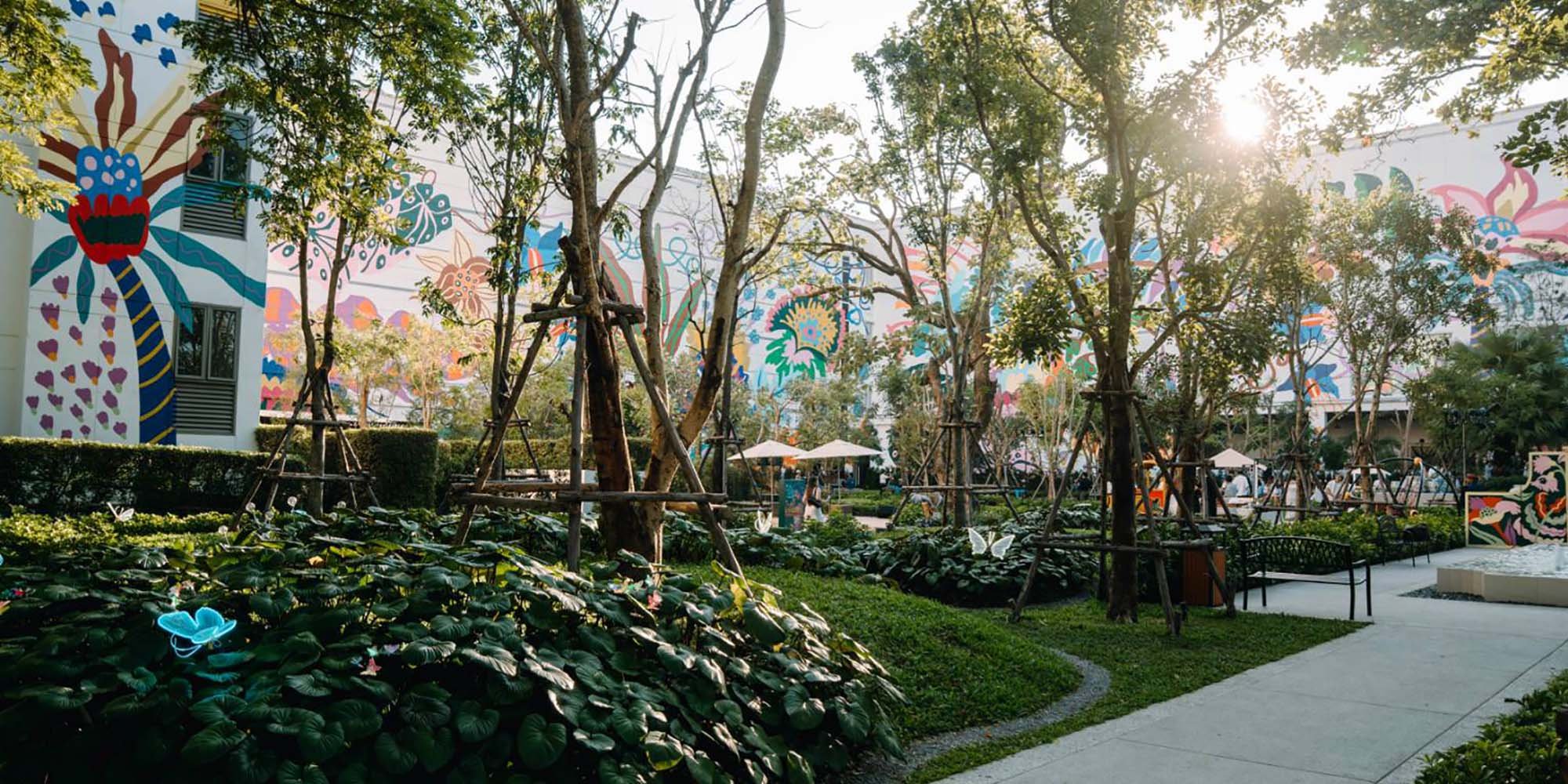 สวนแห่งนี้ได้รับแรงบันดาลใจจากอัตลักษณ์ท้องถิ่น โดยหยิบเรื่องราวของ “คู่ไม้คู่เมือง” อย่างต้นมะขามและต้นจามจุรีอายุกว่า 100 ปี ที่ยืนต้นเคียงข้างกันมาอย่างยาวนาน มาเป็นหัวใจสำคัญในการออกแบบ สะท้อนถึงความผูกพันระหว่างผู้คนกับเมือง สร้างความร่มรื่นและเสน่ห์เฉพาะตัวที่หาได้ยาก แถมยังเติมเต็มมิติทางศิลปะด้วยผลงานจากศิลปินชื่อดังผ่านไฮไลต์ 2 ชิ้น คือ “The Wall” Mural Art ขนาดกว่า 3,000 ตารางเมตร โดยนุ่น – นววรรณ โตวิเศษ ที่สื่อถึงระบบนิเวศในจินตนาการ และ “The Wing” ประติมากรรมโดยโลเล ศิลปินดังที่ถ่ายทอดจิตวิญญาณชาวเลผ่านชายประมงผู้มีปีก