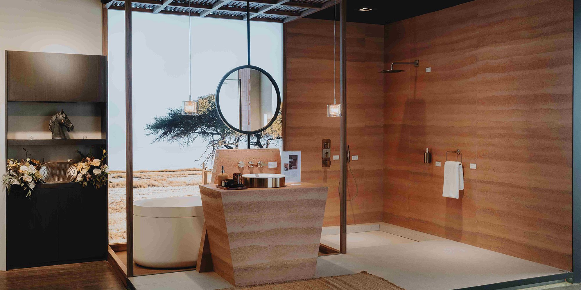 ในงานนี้ผู้ร่วมชมได้สัมผัสบรรยากาศห้องน้ำที่จัดแสดงคอลเลกชันใหม่อย่าง AXOR ShowerSphere และ AXOR Citterio C ซึ่งออกแบบโดยได้รับแรงบันดาลใจจากคอนเซ็ปต์ Western Cape Apartment Residence ของ Antonio Citterio สถาปนิกและนักออกแบบระดับโลกชาวอิตาเลียน พื้นที่นี้สะท้อนความงามแบบธรรมชาติและความหรูหราเรียบง่ายของแอฟริกาใต้ ผ่านวัสดุและพื้นผิวที่เข้ากับบรรยากาศรอบตัว ส่วนก๊อกน้ำ AXOR Citterio C และฝักบัว ShowerSphere สี Brushed Bronze ที่ใช้ในห้องนี้ ก็ช่วยเติมบรรยากาศให้เป็นมุมพักผ่อนที่มีพลังและโดดเด่นบนผนังสีแดงเข้ม