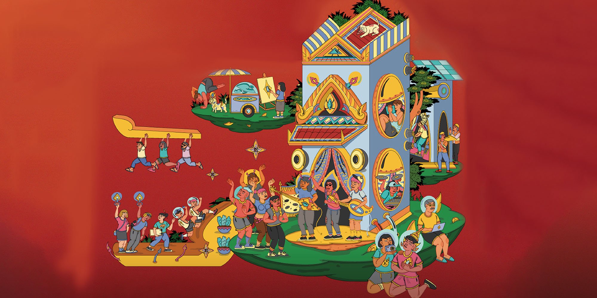 “เกาะที่ทุกคนเห็น จริงๆ แล้วผมอยากให้เป็นเหมือนอยู่บนสวรรค์หรืออยู่ในอากาศ ในแต่ละเกาะจะมีความพิเศษของตัวเอง โดยที่ส่วนประกอบในภาพทั้งหมด ผมได้จากวัตถุดิบไทยในแบบที่ผมเอามาปรุงใหม่ เพราะถ้าสังเกตดีๆ จะเห็นกลิ่นอายของความเป็นตัวละครไทย แต่ถูกจัดการรายละเอียดหรือปรุงให้เป็นลายเส้นของผม จนเกิดเป็นอีกรสชาติหนึ่งแบบไทยๆ และอีกกลิ่นอายหนึ่งคือการใช้สีแดงครับ ตัวพื้นหลังของงานที่เป็นสีแดง นอกจากความหมายในตัวเองที่หมายถึงสีชาติแล้ว สีแดงยังคือสีของอากาศในงานจิตรกรรมไทยด้วย”