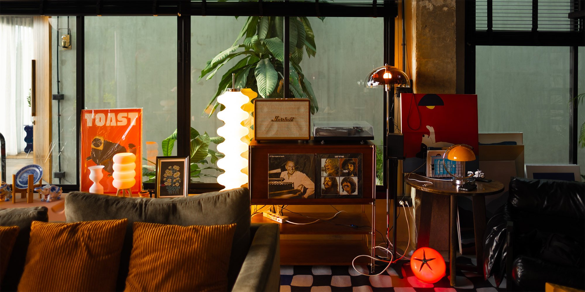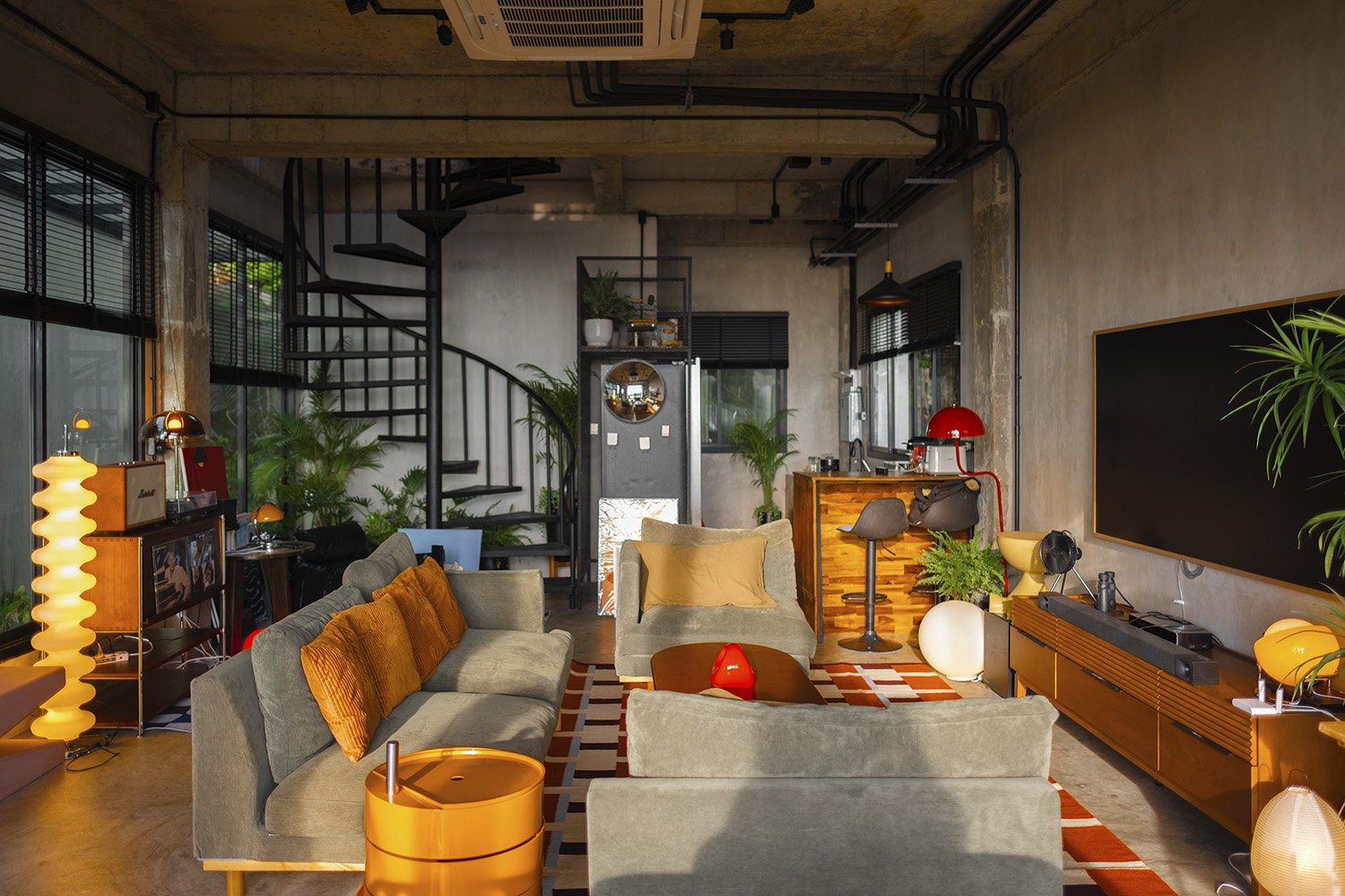 ความเป็นบ้านเก่าทำให้ดิวเริ่มต้นจากการตกแต่งบ้านสไตล์ลอฟต์ ผสมผสานกับของตกแต่งสไตล์แคมปิง แต่ท้ายที่สุดการแต่งบ้านก็มาลงเอยอยู่ที่ความรักในสีสันสดใสของเฟอร์นิเจอร์สไตล์ Mid-Century ที่ดันเข้ากับคอนกรีตเปลือยสไตล์ลอฟต์ได้อย่างดี เฟอร์นิเจอร์ส่วนใหญ่ถูกเลือกให้ใช้เป็นแม่สี โทนของบ้านพักมีความเป็นโทนอุ่นที่ไม่ได้ทำให้รู้สึกร้อน แต่กลับรู้สึกอบอุ่นและผ่อนคลาย ตัวโคมไฟตกแต่ง หรือเฟอร์นิเจอร์ต่างๆ ในบ้านถูกดิวคิดไว้และตั้งใจจัดวางเป็นอย่างดี บางส่วนของห้องก็มีความเป็นโมเดิร์นผสมผสานเข้าไปด้วย บอกเลยว่าไม่ว่าจะมองไปที่มุมไหนของบ้านก็รู้สึกสนุก มองได้ไม่มีเบื่อ